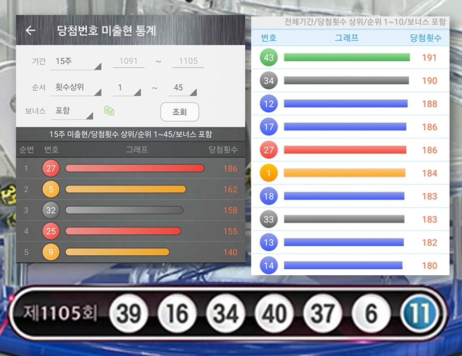 15주간 가장 많이 당첨된 번호와 10주간 미출현 번호를 종합하여 이번 주 로또 1106회 예상 번호를 예측합니다.